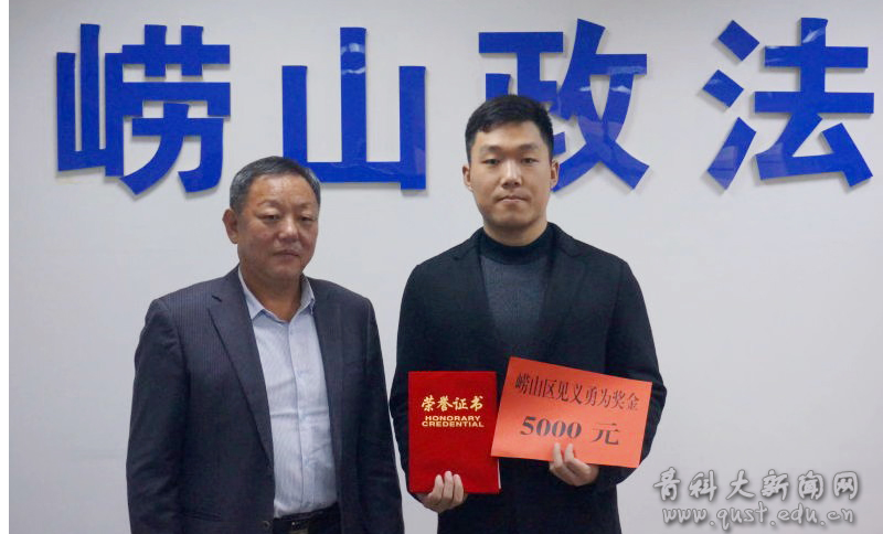 11月30日,崂山区授予王跃熙“崂山区见义勇为先进个人”荣誉称号表彰仪式在区政府举行,崂山区政法委副书记、区综治办主任秦国欣,崂山区综治办副主任姜福平,青岛科技大学pp电子党总支副书…